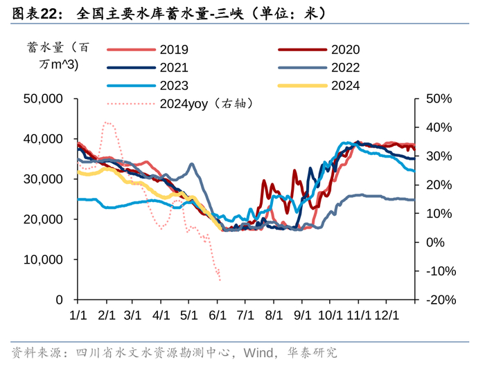2022年上半年水电利用小时远超2019-23年或2019-21年的均值,三峡来水创历史新高;一到7月,来水急转直下,1958年有记录以来的高温天气导致降雨与水电出力达到了历史罕见的低位。2022年汛期蓄能不足导致2023年初枯期水库可以释放的水量较弱,春季西南地区降雨量较小旱情严重,导致上半年水电出力明显低于正常水平;2022年8月来,四川降雨增多、台风气候频发,8-12月水电利用小时已经接近2019-23年的均值。2024年前4个月,水电利用小时依然低于2019-23年平均水平,5/6月利用小时仅超均值2%/6%,但是因为2023年低基数,导致水电发电量同比增长39%/45%,火电发电量相应的同比下滑4%/7%。