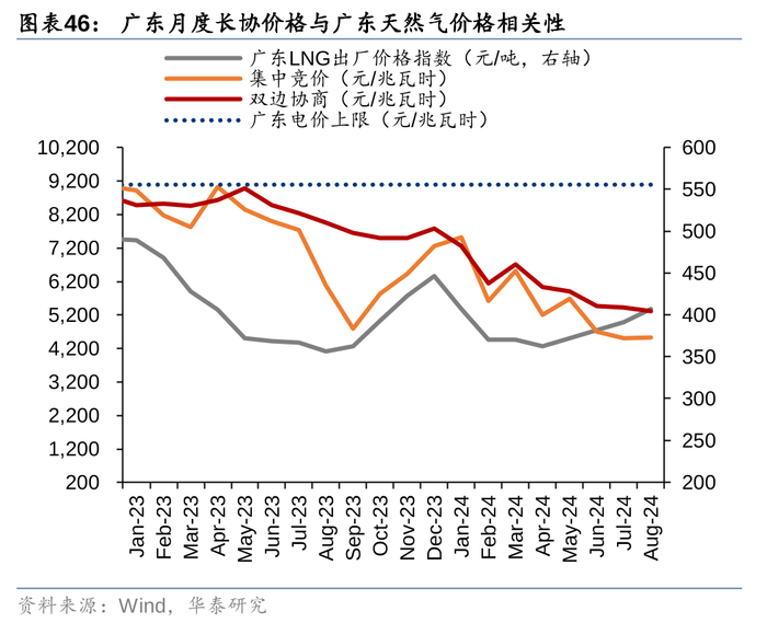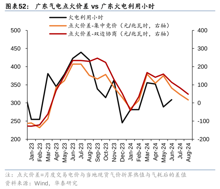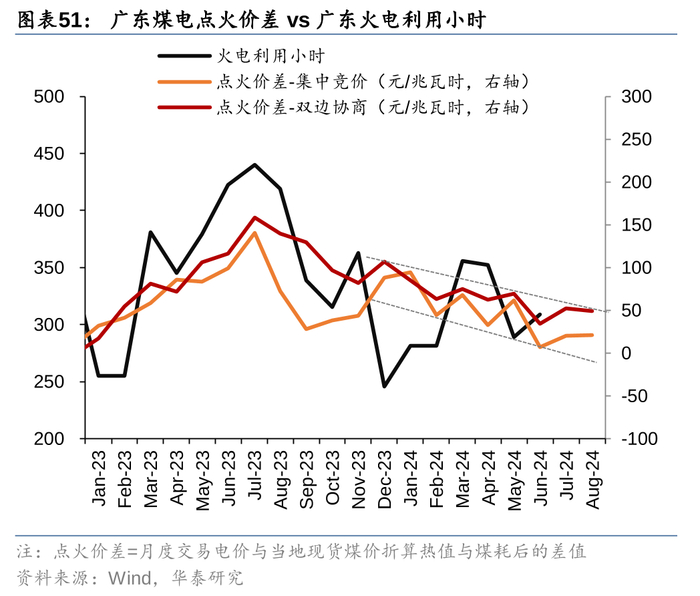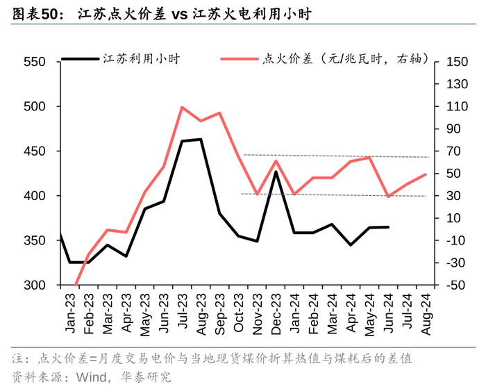 可以注意到,江苏和广东2023年大部分时间利用小时与点火价差呈现高度正相关。2023年底以来,江苏月度电价对应的点火价差一直维持在30到70元/兆瓦时的水平上区间震荡,利用小时的变化其实并没有对盈利空间造成太大影响,短期江苏省月度价格还是和煤价相关性更高(图48)。广东2023年底来,煤电对应的点火价差趋势性向下,我们认为一方面反映了当地电力供需,一方面也是天然气价格高位回落导致的:根据能源局统计数据,今年二季度煤电利用小时同比下滑7%,气电同比下滑14%,但是沿海天然气电厂的LNG采购很难快速调整,在点火价差为正的基础上气电厂有动力降价换量,最终实现天然气的消化。
