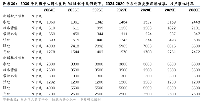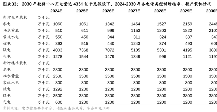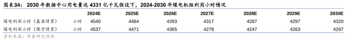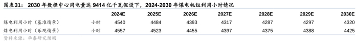 电量方面,由于传统能源中水电/核电建设周期较久(超6/5年),我们认为短期对保供起到主要支撑作用的仍为火电。我们在不同数据中心用电量的情景假设下,对未来火电新增装机与煤电利用小时数进行了测算,当2030年数据中心用电量分别达4331/5342/9414亿度时,全社会用电量对应为14.20/14.30/14.71万亿度,25-27年需核准火电装机50/57/80GW,以支撑27-30年“备用率”回到15%左右,24-30年煤电机组利用小时不低于4247/4287/4375小时,基准情形下煤电机组利用小时不低于“十三五”时期2016/2017年的煤电利用小时(分别为4255/4287小时)。