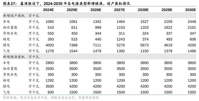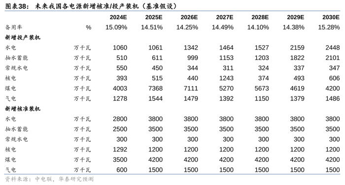 基准假设下:若我国电力系统2027-2030年备用率维持在15%左右,则2024年新增核准水电/核电/煤电/气电分别2800/1292/3500/600万千瓦;2025年及之后每年新增核准水电/核电/煤电/气电分别3800/1200/4200/1500万千瓦。