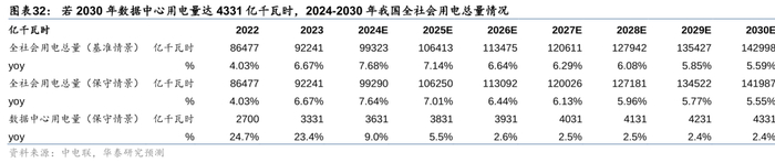 在保守情景下,我们假设2024/2025/2026年及之后年数据中心用电量年增300/200/100亿千瓦时,即2030年我国数据中心年用电量达4331亿度,则我国全社会用电总量增速较基准情景放缓,至2030年全社会用电总量将达141987亿千瓦时,较基准假设下的142998亿千瓦时减少1011亿千瓦时用电量。