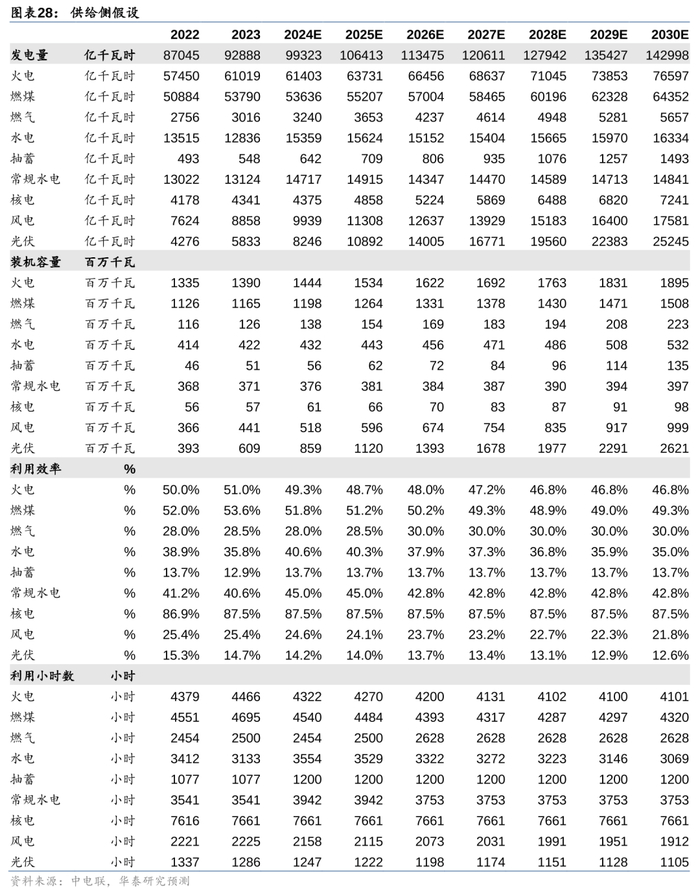 4)利用小时:历史年度利用小时为中电联披露数据,预测期火电/水电/核电利用小时为利用效率*365*24;风电/光伏的利用小时我们假设2024-2030年逐年同比略有下滑。