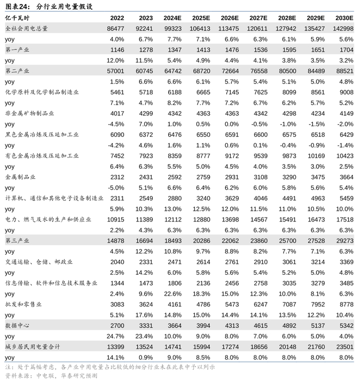 2)各行业用电量:我们参考Wind披露的各细分行业1H24用电量同比增速,及2024年6月份单月用电量同比增速,对各行业2024年用电量同比增速进行预测。如第二产业的化学原料及化学制品制造业,1H24用电量为2969亿千瓦时,同比+7.7%;2024年6月份用电量为504亿千瓦时,同比+9.8%;我们假设其2024年全年用电量价格同比增长8.2%至6188亿千瓦时。需要说明的是,由于在电力统计中,数据中心的实际耗电量常常被混合计入不同的行业范畴,因此,数据中心能耗统计困难,目前尚无得到权威认定的官方数据。我们假设其2024年用电量将以10%的同比增速增长,随后同比增速逐年下滑1.0pp,2030年数据中心用电量达5342亿千瓦时。