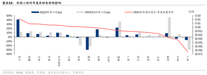 上图中可以看出,四川、新疆、江苏等利用小时较高的地区电价2024年考虑容量电价后并没有下跌,广东2024降电价幅度大与火电需求疲软应该也有较大关系。其中,湖北利用小时下滑较多但是电价相对坚挺,我们认为还是与当地火电成本较高(华中煤炭运距较远)有关;安徽和福建虽然利用小时较好但是电价并没有特别高的同比提升,可能还是与当地火电扭亏有关;蒙西、宁夏等地新能源占比提升较快,对火电的议价能力也造成一定压力。