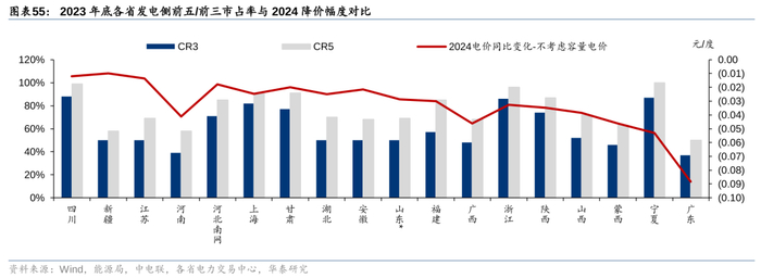 作为区域层面市场化交易的品种,发用电双方的集中度(垄断力)也对最终的电价有很大的影响。广东、广西和河南的电价下滑幅度较大与当地火电企业分散度较高有关,集中度较高的四川、上海、甘肃等地2024年电价降幅相对较小。