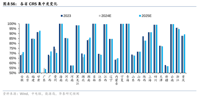 根据我们对目前所有在役和在建火电项目的统计,2023-25年CR5市占率超过90%的省份包括浙江、云南、四川、北京、上海、青海、宁夏、江西、吉林、黑龙江和海南,未来3年市占率有望提升的省份包括安徽、甘肃、广西、湖南和内蒙古。