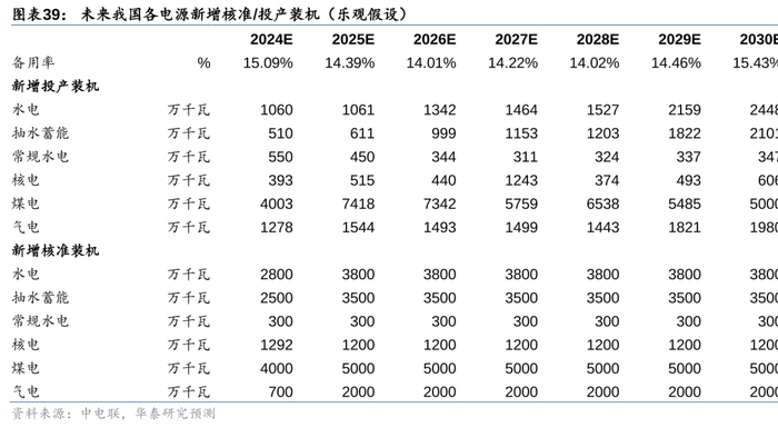 乐观假设下:若我国电力系统2027-2030年备用率维持在15%左右,则2024年新增核准水电/核电/煤电/气电分别2800/1292/4000/700万千瓦;2025年及之后每年新增核准水电/核电/煤电/气电分别3800/1200/5000/2000万千瓦。