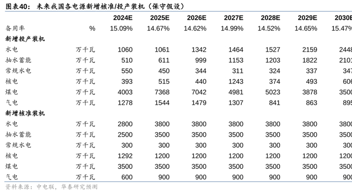 火水核等传统电源增量将成为新常态。据电力信息共享平台与储能头条公众号数据,2022/2023/1H24我国核准煤电项目103/123/11GW,气电项目33/10/2GW,抽水蓄能项目68/50/10GW,均远超历史中枢水平。核电作为最清洁的基荷电源,审批常态化后,我们认为未来有望每年核准10台新机组。随核准项目产能逐步释放,传统电源设备订单发展空间广阔。且我们预测2024-2027年火电的新增核准会维持在41~57GW的水平,使得2027-2030年的备用率回到15%左右的水平,保障电力供应安全。