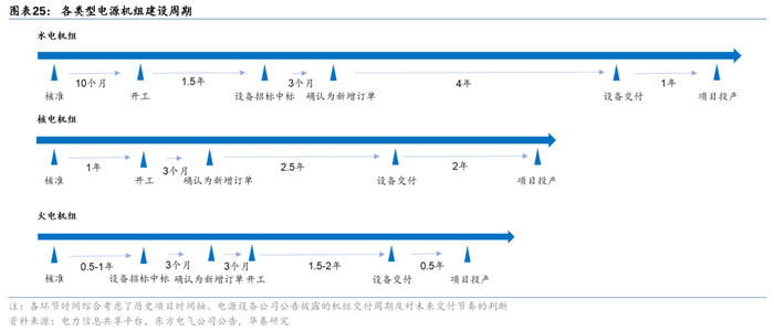 2)装机容量:基于储能头条公众号及电力信息共享平台等数据,我们对我国水电、火电、核电机组的核准、开工、设备交付、投产等环节进行了数据跟踪,并对各类型机组建设周期进行了梳理。