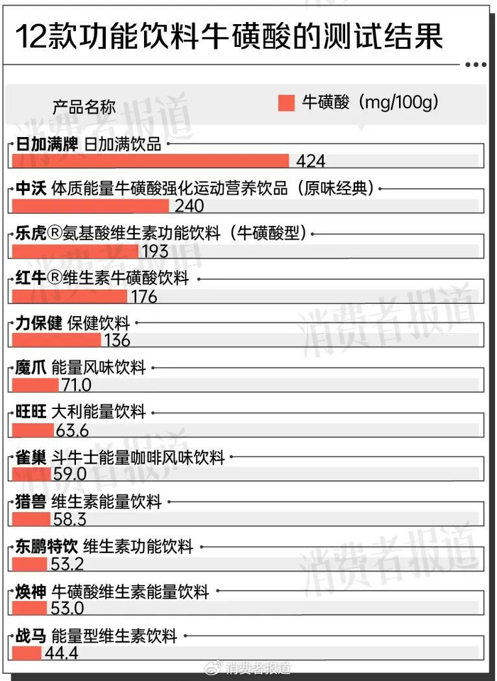 此次测评的12款功能饮料,包装上均标示其添加了抗疲劳成分牛磺酸。检测结果显示,不同功能饮料牛磺酸含量差距悬殊,最高近10倍。牛磺酸含量最高的样本是日加满牌,实测值为424mg/100g,其次是中沃、乐虎、红牛、力保健,牛磺酸含量均超过100mg/100g。部分产品牛磺酸含量较低,其中东鹏特饮为53.2mg/100g,焕神为53.0mg/100g,战马为44.4mg/100g。