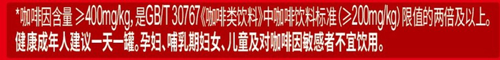 对于咖啡因的饮用建议,雀巢回复本刊称:“已经在产品标签上做了标示”。产品标签资料显示,咖啡因含量≥400mg/kg,是GB/T 30767《咖啡类饮料》中咖啡饮料标准(≥200mg/kg)限值的两倍及以上。健康成年人建议一天一罐。孕妇、哺乳期妇女、儿童及对咖啡因敏感者不宜饮用。