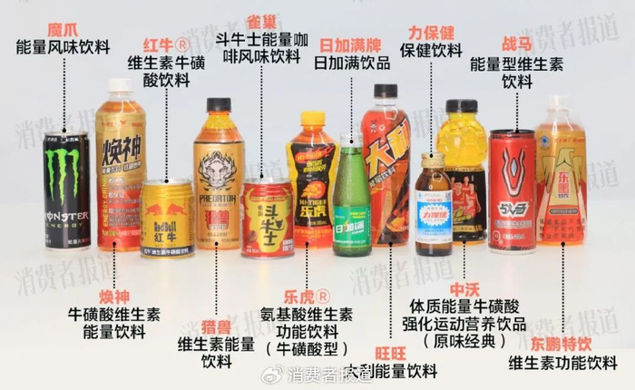 红牛Ⓡ维生素牛磺酸饮料、东鹏特饮维生素功能饮料、战马能量型维生素饮料、焕神牛磺酸维生素能量饮料、雀巢斗牛士能量咖啡风味饮料、乐虎Ⓡ氨基酸维生素功能饮料(牛磺酸型)、力保健保健饮料、日加满牌日加满饮品、魔爪能量风味饮料、旺旺大利能量饮料、猎兽维生素能量饮料、中沃体质能量牛磺酸强化运动营养饮品(原味经典)