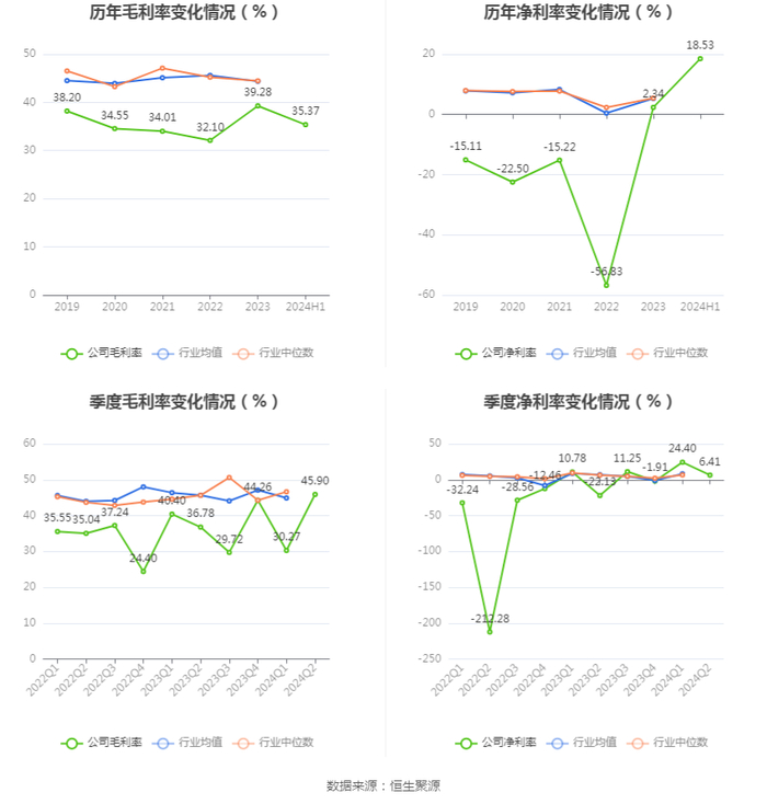 2024年上半年,公司毛利率为35.37%,同比下降4.05个百分点;净利率为18.53%,较上年同期上升16.69个百分点。从单季度指标来看,2024年第二季度公司毛利率为45.90%,同比上升9.12个百分点,环比上升15.63个百分点;净利率为6.41%,较上年同期上升28.54个百分点,较上一季度下降17.99个百分点。