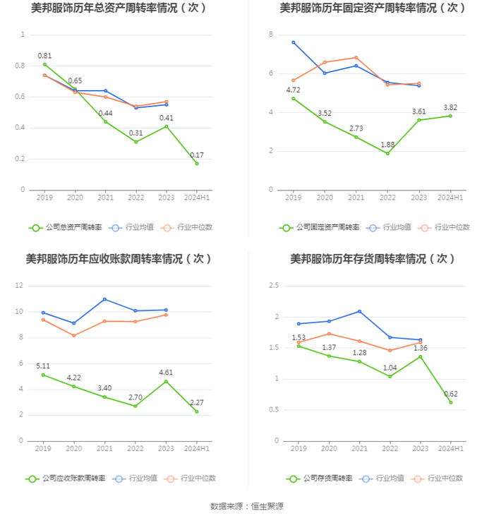 营运能力方面,2024年上半年,公司总资产周转率为0.17次,上年同期为0.16次(2023年上半年行业平均值为0.26次,公司位居同行业31/40);固定资产周转率为3.82次,上年同期为0.86次(2023年上半年行业平均值为2.51次,公司位居同行业35/40);公司应收账款周转率、存货周转率分别为2.27次、0.62次。