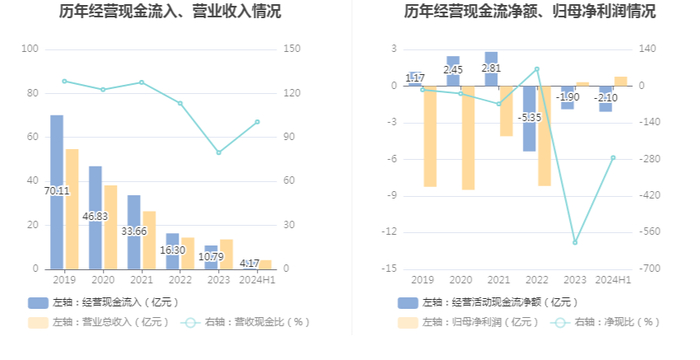 2024年上半年,公司经营活动现金流净额为-2.10亿元,同比减少2.21亿元,主要由于报告期内购买商品、接受劳务支付的现金同比增加所致;筹资活动现金流净额-2.21亿元,同比增加3.43亿元,主要由于报告期内偿付债务支付的现金有所下降所致;投资活动现金流净额3.84亿元,上年同期为6.14亿元,主要由于上年同期收到处置华瑞银行部分股权款所致。