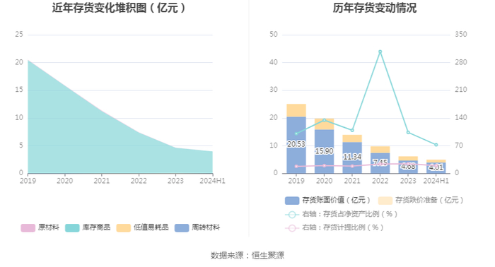 从存货变动来看,截至2024年上半年末,公司存货账面价值为4.01亿元,占净资产的72.45%,较上年末减少6669.99万元。其中,存货跌价准备为9822.58万元,计提比例为19.66%。