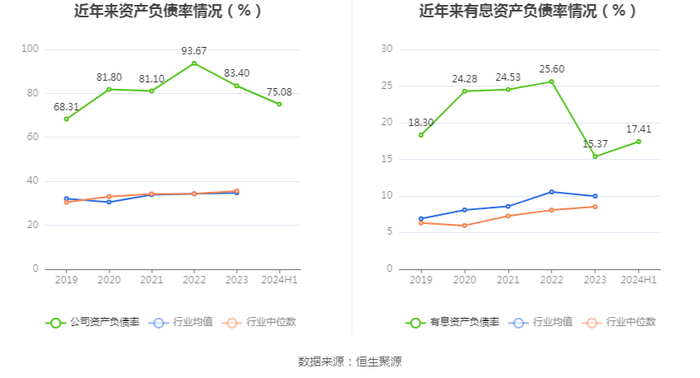 在偿债能力方面,公司2024年上半年末资产负债率为75.08%,相比上年末下降8.32个百分点;有息资产负债率为17.41%,相比上年末上升2.04个百分点。
