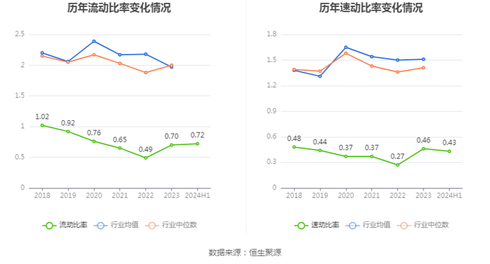 2024年上半年,公司流动比率为0.72,速动比率为0.43。
