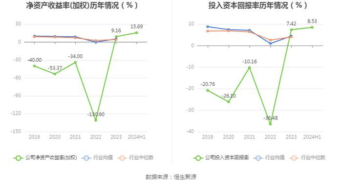 数据显示,2024年上半年公司加权平均净资产收益率为15.69%,较上年同期增长11.62个百分点;公司2024年上半年投入资本回报率为8.53%,较上年同期增长6.15个百分点。