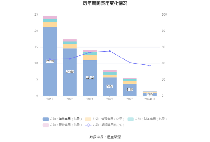2024年上半年,公司期间费用为1.56亿元,较上年同期减少502.70万元;但期间费用率为37.58%,较上年同期上升8.80个百分点。其中,销售费用同比增长10.37%,管理费用同比下降7.23%,研发费用同比下降27.95%,财务费用同比下降34.89%。