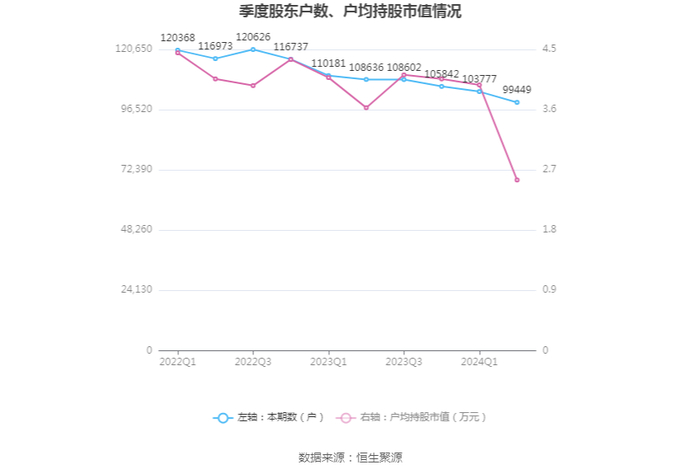 筹码集中度方面,截至2024年上半年末,公司股东总户数为9.94万户,较一季度末下降了4328户,降幅4.17%;户均持股市值由一季度末的3.97万元下降至2.55万元,降幅为35.77%。