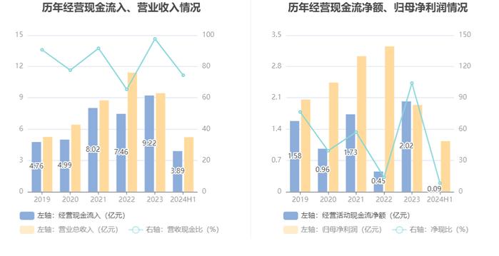 2024年上半年,公司营业收入现金比为74.42%,净现比为8.20%。