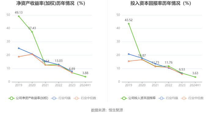数据显示,2024年上半年公司加权平均净资产收益率为3.88%,较上年同期下降2.42个百分点;公司2024年上半年投入资本回报率为3.63%,较上年同期下降2.34个百分点。