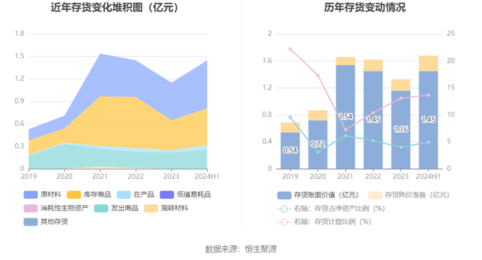 从存货变动来看,截至2024年上半年末,公司存货账面价值为1.45亿元,占净资产的4.96%,较上年末增加2942.52万元。其中,存货跌价准备为2299.5万元,计提比例为13.67%。