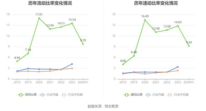 2024年上半年,公司流动比率为9.78,速动比率为9.24。