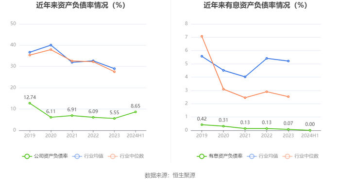 在偿债能力方面,公司2024年上半年末资产负债率为8.65%,相比上年末上升3.10个百分点;有息资产负债率为0.00%,相比上年末下降0.07个百分点。