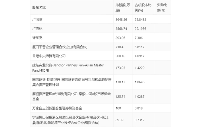 半年报显示,2024年上半年末公司十大流通股东中,新进股东为万家自主创新混合型证券投资基金,取代了一季度末的交通银行股份有限公司-万家行业优选混合型证券投资基金(LOF)。在具体持股比例上,香港中央结算有限公司持股有所上升,国信证券-招商银行-国信证券鼎信10号科创板战略配售集合资产管理计划、摩根资产管理(新加坡)有限公司-摩根中国A股市场机会基金、宁波梅山保税港区晨道投资合伙企业(有限合伙)-长江晨道(湖北)新能源产业投资合伙企业(有限合伙)持股有所下降。