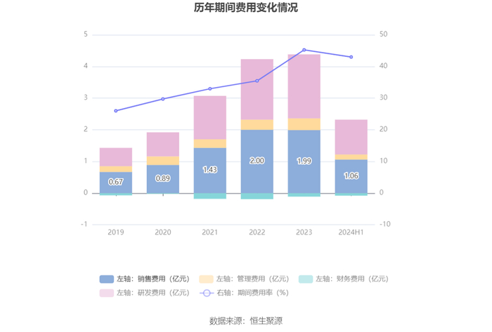 2024年上半年,公司期间费用为2.24亿元,较上年同期增加345.99万元;期间费用率为42.97%,较上年同期上升7.28个百分点。其中,销售费用同比下降0.82%,管理费用同比下降15.63%,研发费用同比增长5.28%,财务费用由去年同期的-953.60万元变为-767.22万元。