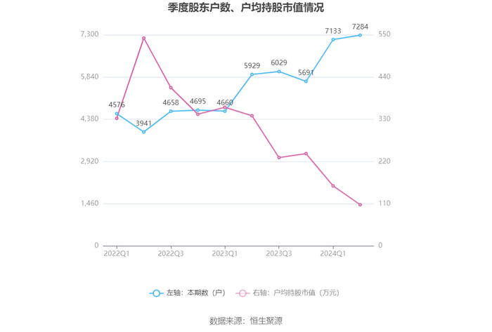 筹码集中度方面,截至2024年上半年末,公司股东总户数为7284户,较一季度末增长了151户,增幅2.12%;户均持股市值由一季度末的156.71万元下降至107.45万元,降幅为31.43%。