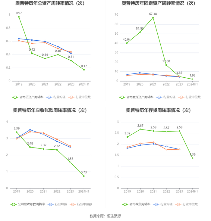 营运能力方面,2024年上半年,公司总资产周转率为0.17次,上年同期为0.20次(2023年上半年行业平均值为0.18次,公司位居同行业11/25);固定资产周转率为1.93次,上年同期为3.36次(2023年上半年行业平均值为2.29次,公司位居同行业8/25);公司应收账款周转率、存货周转率分别为0.73次、1.36次。