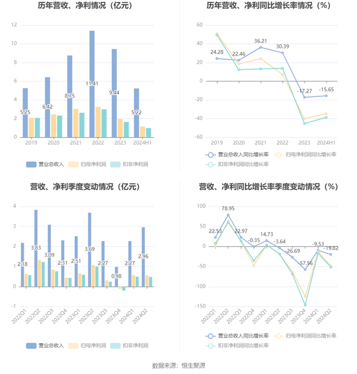 根据半年报,公司第二季度实现营业总收入2.96亿元,同比下降19.82%,环比增长30.38%;归母净利润5605.3万元,同比下降48.12%,环比下降2.18%;扣非净利润4819.54万元,同比下降51.70%,环比下降1.47%。
