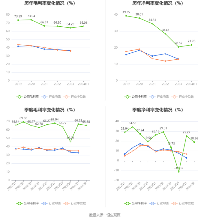 2024年上半年,公司毛利率为66.01%,同比下降1.25个百分点;净利率为21.70%,较上年同期下降6.35个百分点。从单季度指标来看,2024年第二季度公司毛利率为65.38%,同比下降2.56个百分点,环比下降1.44个百分点;净利率为18.96%,较上年同期下降10.35个百分点,较上一季度下降6.31个百分点。