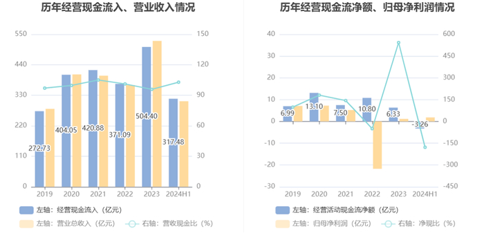 2024年上半年,公司经营活动现金流净额为-3.26亿元,同比增加520.66万元;筹资活动现金流净额-8782.77万元,同比增加2.04亿元;投资活动现金流净额1.98亿元,上年同期为2606.71万元,主要系较上年同期,公司处置部分对外投资产生的现金流入大于公司对外投资的现金流出所致。