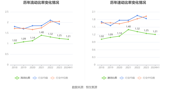 2024年上半年,公司流动比率为1.21,速动比率为1.21。