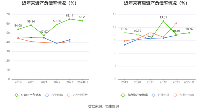 在偿债能力方面,公司2024年上半年末资产负债率为63.23%,相比上年末下降1.88个百分点;有息资产负债率为10.76%,相比上年末上升0.36个百分点。