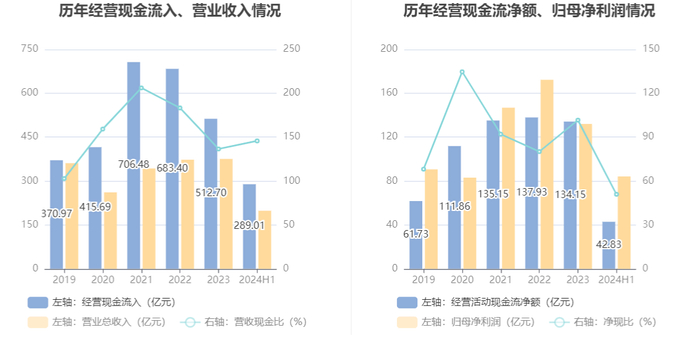 2024年上半年,公司营业收入现金比为145.69%,净现比为50.90%。