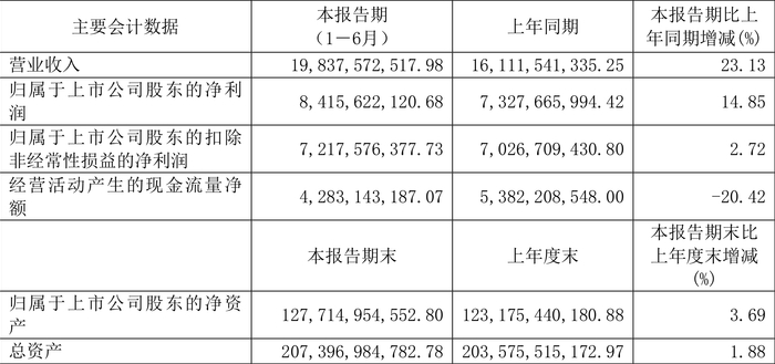 根据半年报,公司第二季度实现营业总收入108.86亿元,同比增长28.64%,环比增长21.62%;归母净利润47.19亿元,同比增长24.95%,环比增长27.67%;扣非净利润39.26亿元,同比增长6.55%,环比增长19.28%。