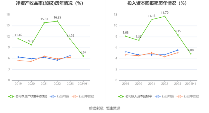 数据显示,2024年上半年公司加权平均净资产收益率为6.67%,较上年同期增长0.35个百分点;公司2024年上半年投入资本回报率为4.88%,较上年同期增长0.12个百分点。