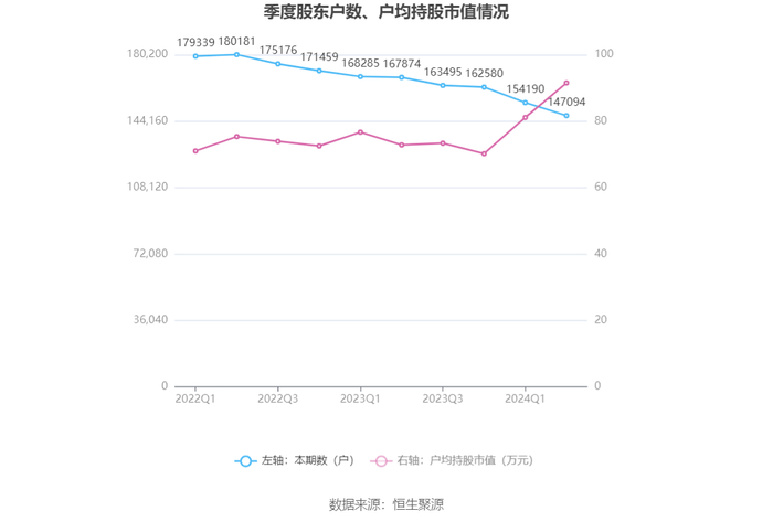 筹码集中度方面,截至2024年上半年末,公司股东总户数为14.71万户,较一季度末下降了7096户,降幅4.60%;户均持股市值由一季度末的81.09万元上升至91.49万元,增幅为12.83%。