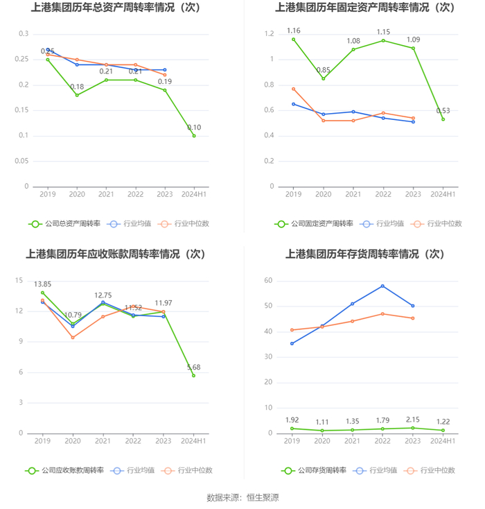 营运能力方面,2024年上半年,公司总资产周转率为0.10次,上年同期为0.09次(2023年上半年行业平均值为0.11次,公司位居同行业15/17);固定资产周转率为0.53次,上年同期为0.49次(2023年上半年行业平均值为0.28次,公司位居同行业2/17);公司应收账款周转率、存货周转率分别为5.68次、1.22次。