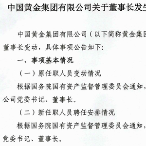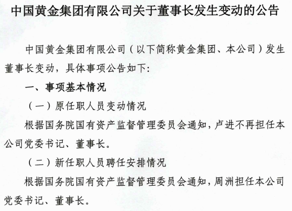 【大河财立方消息】8月30日,中国黄金集团有限公司发布公告称,根据国务院国资委通知,卢进不再担任公司党委书记、董事长,周洲担任公司党委书记、董事长。相关工商备案尚未完成办理。