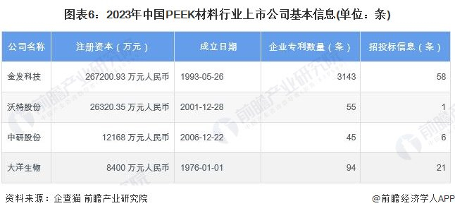 从PEEK材料行业的上市企业布局和已有公开信息分析,注册资本最多的是金发科技,同时,金发科技专利与招投标信息最多,大洋生物成立时间最早。