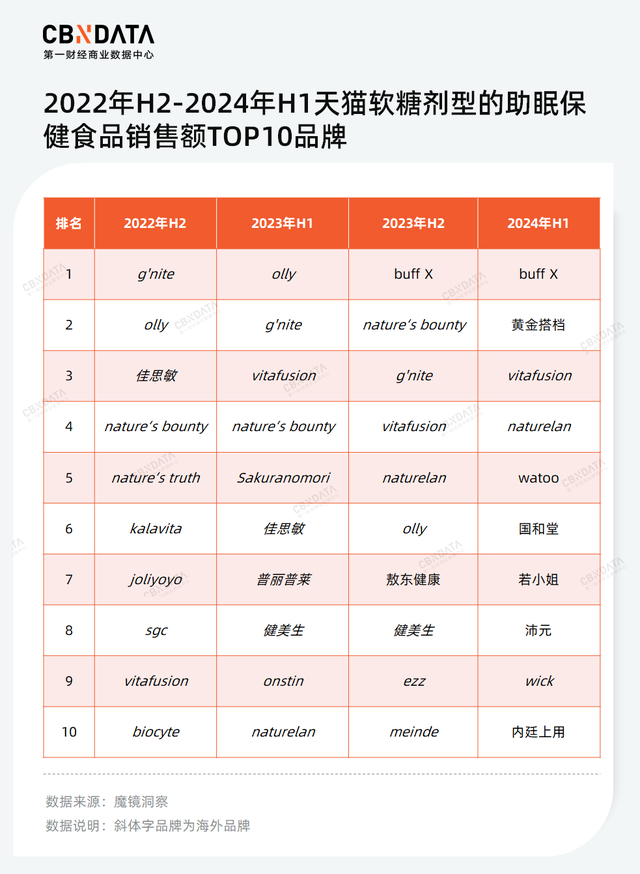 近几年,一些“新品牌”凭借“轻养生”的浪潮获得了出头的机会。以软糖剂型的助眠保健食品为例,过去,软糖类的助眠保健品主要以海外品牌为主,而如今,越来越多的国货品牌成功上榜。其中,成立于2020年的buff X更是在去年下半年直接冲上榜首,并在今年下半年依旧是软糖剂型助眠保健品销售额最高的品牌。
