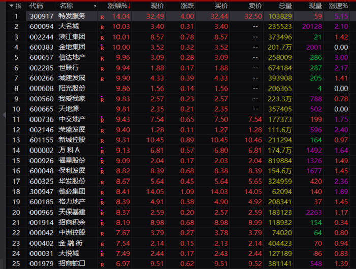 房地产板块多股涨停。特发服务大涨超14%,大名城,滨江集团,我爱我家等封板。值得一提的是,万科、保利、招商蛇口等股票皆出现明显异动。这基本意味着整个板块迎来了大利好。港股地产股也是持续走高,万科企业、旭辉控股集团涨超16%。