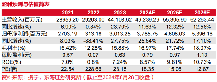 盈利预测与投资评级:行业景气不断提升,公司以完整产业链优势推动各板块工作量持续增加,同时公司在不断开拓市场尤其是国外市场初期阶段,毛利率或会受到一定影响,随着未来公司技术保障及品牌影响力提升,毛利也会进一步提高。我们预测公司2024-2026年实现营收492.39/553.06/622.63亿元(此前预测为499.11/532.66/594.90亿元),实现归母净利润37.86/46.08/53.96亿元(此前预测为41.54/51.14/59.33亿元),对应EPS分别为0.79/0.97/1.13元(此前预测为0.87/1.07/1.24元),对应PE分别为18.35/15.08/12.87倍,维持“买入”评级。