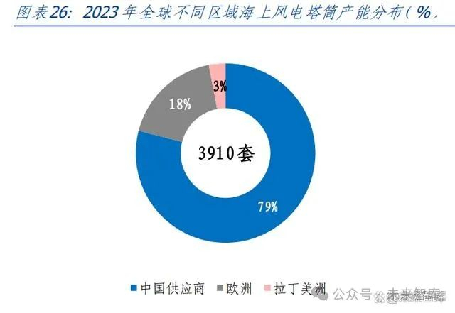海外风电塔筒和固定式基础将出现不同程度的产能不足。2023 年,全球海上风电塔筒产 能约 3910 台套,中国产能占据全球市场份额近 80%,欧洲占据 18%。欧洲海塔年产能 目前为 700 套,可以满足 2023-2025 年的需求,预计从 2026 年起,海上风电塔筒的需 求量将超过年产量,若达成年增加400 套的生产计划,可能缓解2026-2027 的瓶颈问题, 而 2028 年以后仍将面临短缺;北美、拉丁美洲等地区暂无海上风电塔筒生产基地,若 限制性贸易政策出现且当地没有新的投资,预计将出现瓶颈。 未来风电基础将向深远海发展,导管架和浮式基础的市场份额预计会逐年增加,近 5 年 内单桩仍是海上风电基础结构的主流产品。根据 GWEC 报告《MISSION CRITICAL: BUILDING THE GLOBAL WIND ENERGY SUPPLY CHAIN FOR A 1.5°C WORLD》,分区域 看,亚太地区已取代欧洲成为固定式基础最主要产地,占全球产能的 81%,其次为欧洲 和北美洲。预计到 2026 年,全球计划新增超过 2200 套设备,其中中国贡献 53%,欧 洲贡献 33%。根据 GWEC 预测,2024-2028 年,欧洲等海外市场的海上风电基础结构 需要的单桩产品将占据 80%以上的市场份额。仅中国海上风电的固定式基础供大于求, 除中国以外,全球海上风电基础结构的产能满足率不到 70%。鹿特丹的 Sif 公司、埃斯 比约的波罗的海结构公司(Baltic Structures)和英国的 SEaH 公司正在建设三座新的海 上风机基础制造厂。即使欧洲主要海工企业在 2026 年以前完成扩产,总体产能满足率 仅维持在不到 60%,产能扩张速度仍无法满足市场需求的增长速度。